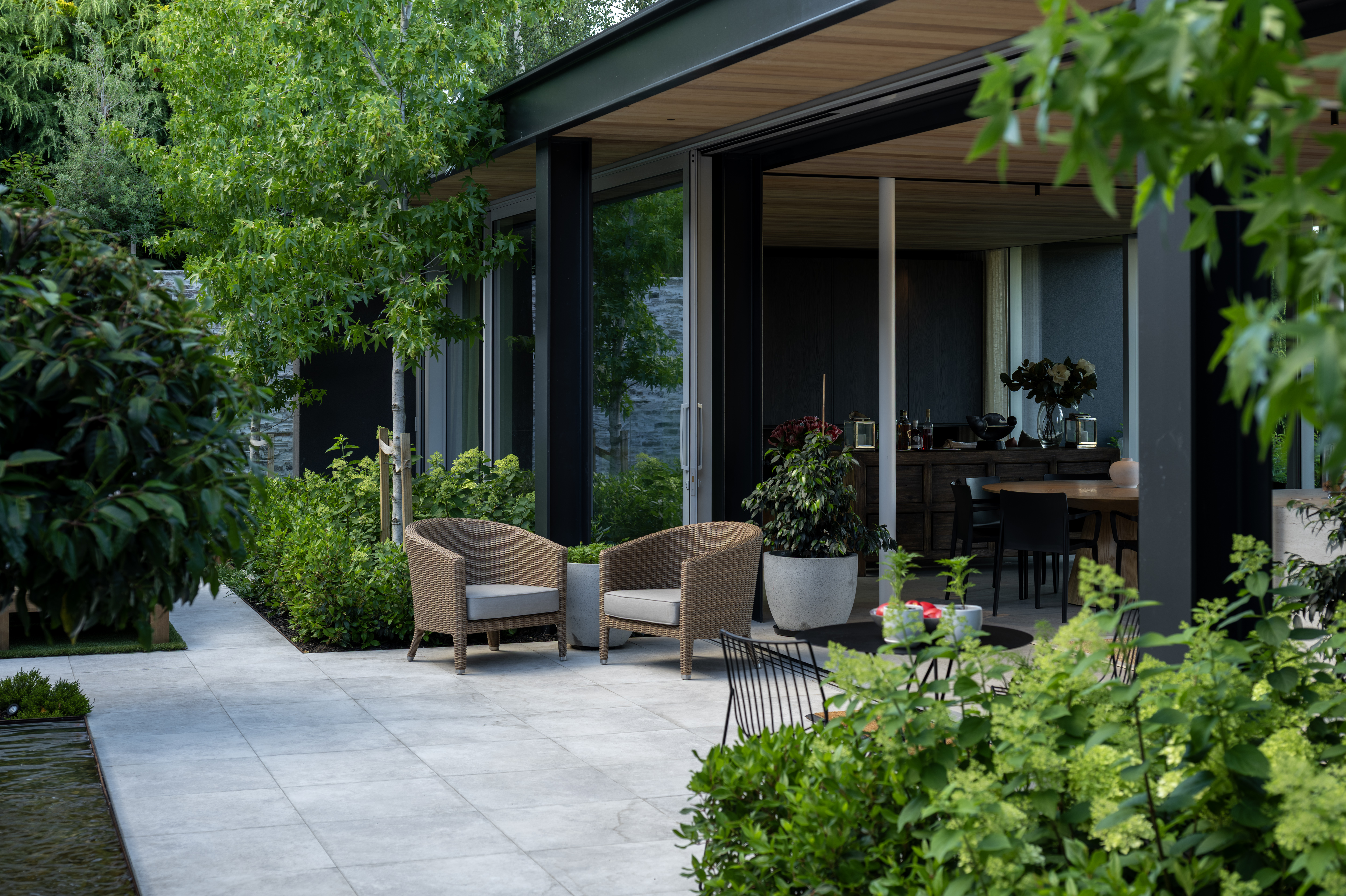 A building sits nestled down, intentially designed to screen neighbours.
