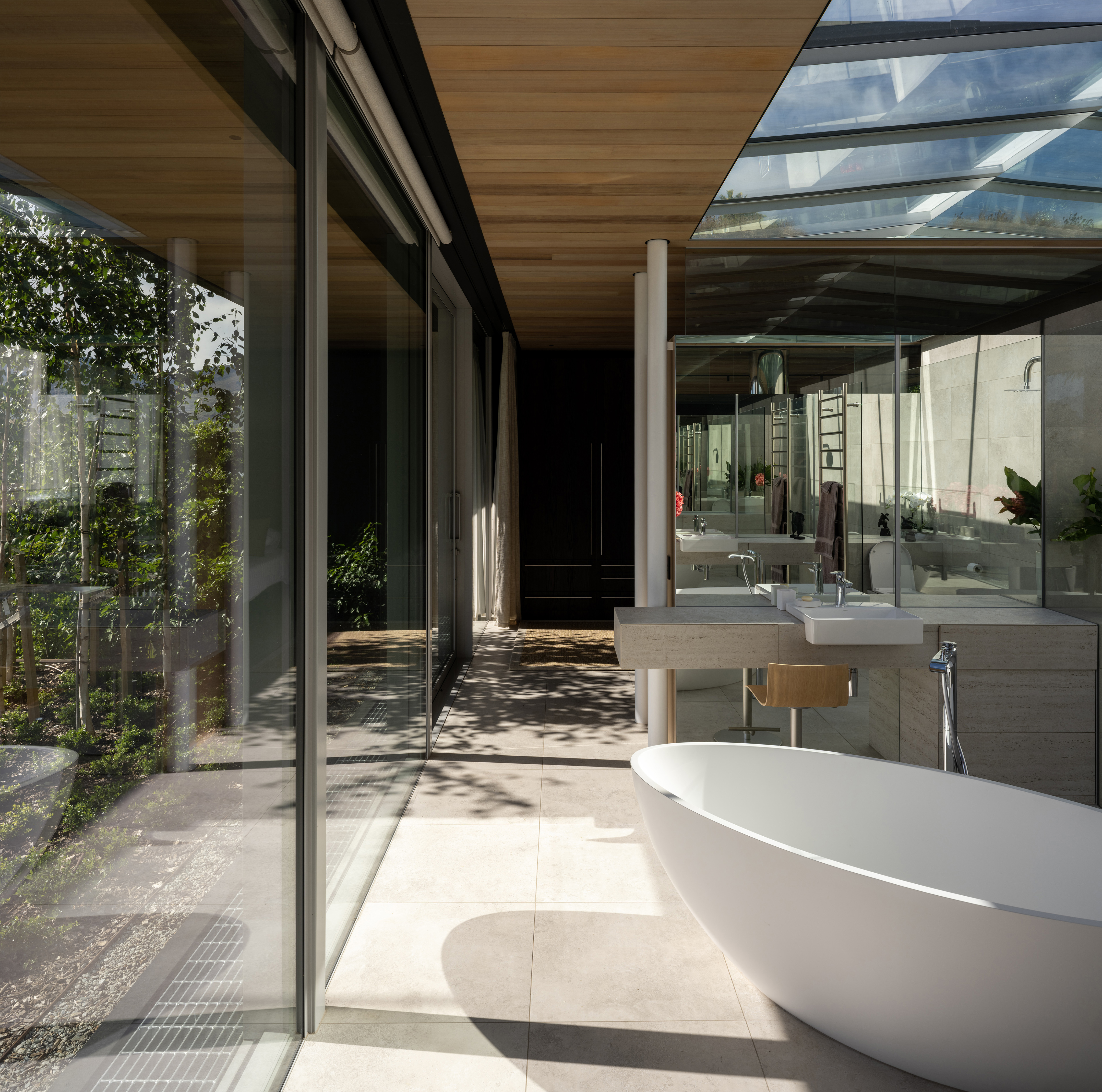 Timber ceiling linings and cabinetry pieces soften the house, bringing in warmth and texture. Light filters through the house casting mood through the interplay of light and shadow. A considered combination of privacy, openness, and connection to the environment